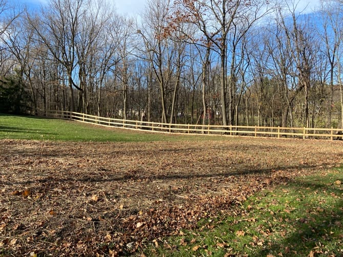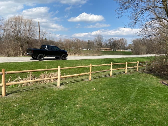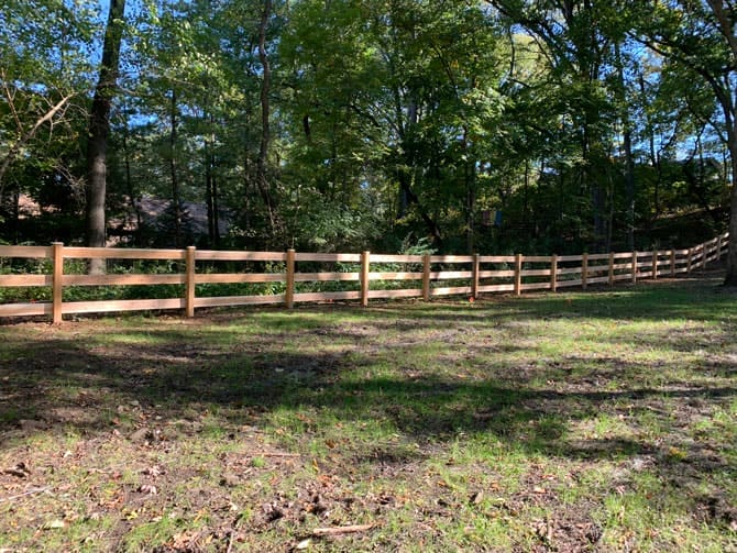 Split rail fences are ideal for large properties where visibility is key. This open, rustic style uses horizontal rails and widely spaced posts to mark boundaries without blocking views. The split rail design is a practical choice for marking large properties or ranches or adding character to rural landscapes.